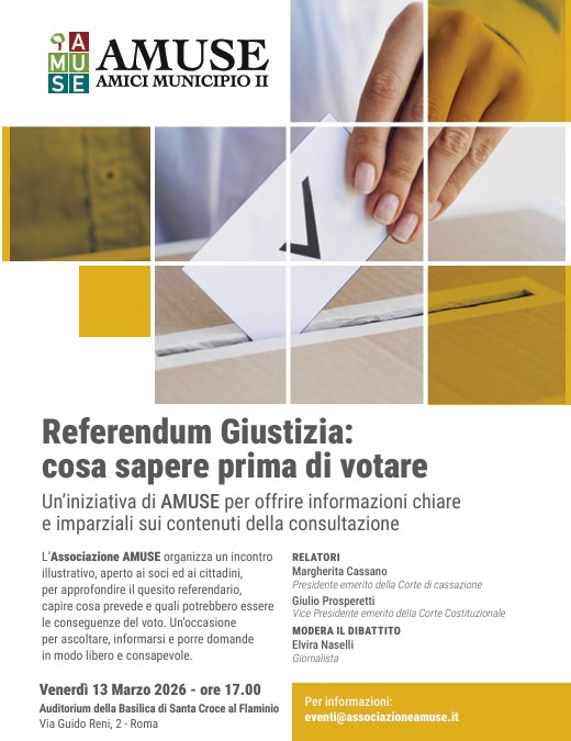 In vista del referendum sulla giustizia, AMUSE promuove un incontro di approfondimento aperto alla cittadinanza per offrire informazioni chiare, rigorose e imparziali sui contenuti della consultazione.