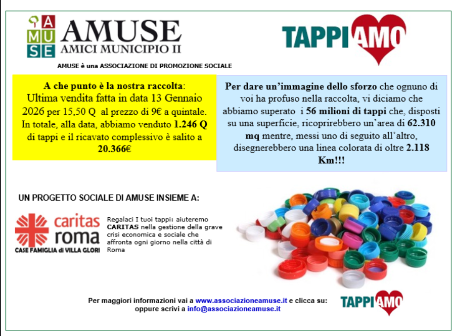 I tappi, venduti al prezzo di 9€ a Quintale, hanno comportato un incasso di 139,50€ e portato il Totale di Progetto a 20.366 €. Come sapete tutto l’incasso viene destinato alla Caritas di Roma per i tanti casi, purtroppo in aumento, di aiuto alla povertà.