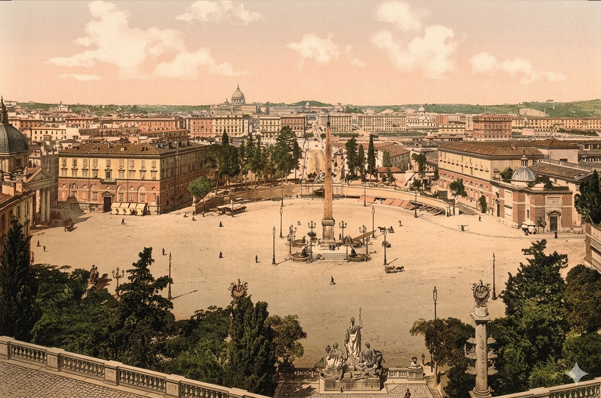 Nella fotografia, ripresa nel 1890 dal pallone di Louis Godard, è possibile vedere in primo piano il mattatoio fuori Porta del Popolo e, inoltre, si riconoscono: i muraglioni del Tevere e il ponte Regina Margherita in costruzione, la Passerella di Ripetta, che sarà sostituita dal Ponte Cavour, e la cupola dell’Augusteo.”